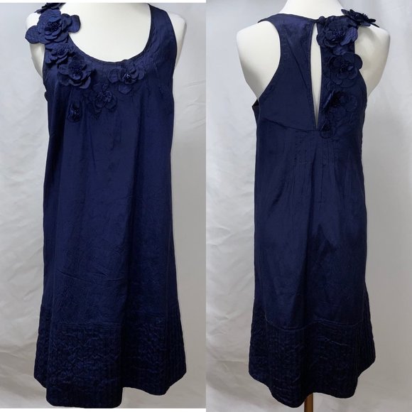 Absolutely beautiful Calypso St. Barth dress. Beaded flower appliques on bodice. Silk fabric is rich and has crinkle in it. Flattering straight cut. Sleeveless. Scoop neck. At or above the knee on most.