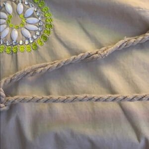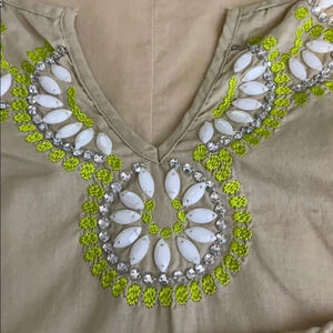 Calypso St. Barth for Target Embellished Dress in a size medium. Excellent pre-owned condition. Only flaw is the cord belt unraveling a bit on one end, shown in pic. Jewel embellished neckline, split neck, embroidered, fully lined, sleeveless, in seam pockets on both sides. Color is called pita bread. Approximate measurements: 19" bust, 36" length.
