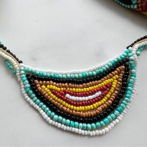 Seed beads in blue, light brown, yellow, red, white, and black make up this long statement necklace that is sure to make a simple tee just pop!