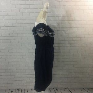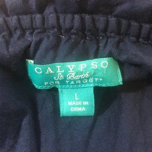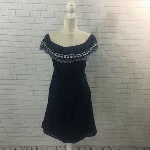Lightweight navy blue mid length off shoulder dress by Calypso St. Barth for Target. Scalloped ruffle w/ white embroidery. Smocking at waist. Lined. Size large.