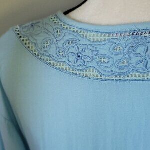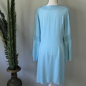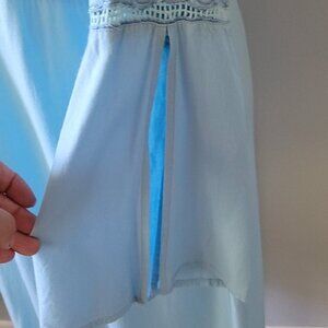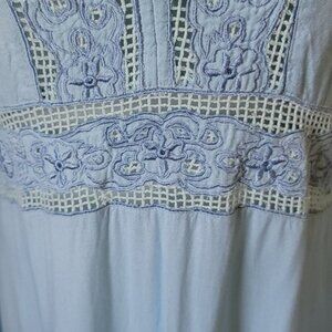 Mint green weave and sky blue embroidery adorn the neck, empire waist, and split long sleeves.