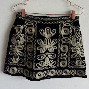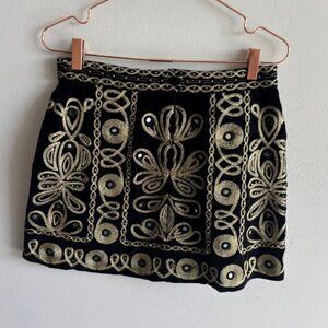 Elevate your wardrobe with this stunning Calypso mini skirt. Featuring intricate golden embroidery against a sleek black backdrop, this Size XSmall piece exudes effortless elegance. Perfect for adding a touch of bohemian flair to any ensemble.