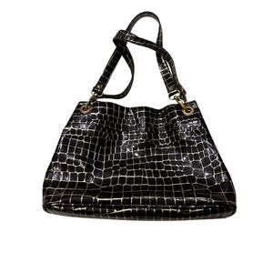 Black and gold calypso shoulder bag in excellent preowned condition with multiple inside pockets inside pockets with zippers and magnetic closure
