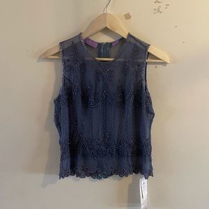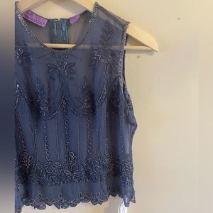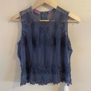 This sleeveless tank top is a hip, modern take on a classic with definite Great Gatsby vibes. Iridescent beading throughout in an art deco style pattern. Zipper in back. Sleeveless. Sheer. Made of 100% pure silk. As seen on Kate Winslet.