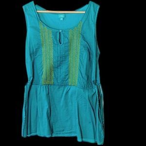 Calypso St Barth For Target. Very lightweight cotton summer top with drawstring waist will accommodate variations in waist size. Single pearl button front closure at the neck. Beautiful color combo of turquoise or deep aqua with lime green embroidered accents.