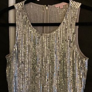 Calypso St Barth sleeveless silver sequin sheath dress with round neckline and back zipper with hook and eye. A line silhouette. Size XS.