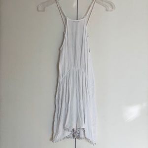 Here's a really cute white romper, or beach cover-up from the Calzedonia Cobey label (this is a disinct registered trademark of Calzedonia S.p.A. of Italy). Unfortunately, there is no size, material, or care tag inside, so please pay close attention to the measurements. I'm filing it under Small, but it could possibly also fit an Extra Small, or a fairly slim Medium. The romper is in VGUC, with no holes, tears, stains, or flaws, it is just wrinkly. The material feels nice and light, and is semi sheer. It features step-in styling, a cute pom-pom fringe around the shorts, adjustable spaghetti straps, and a pretty open-V pattern & lace-up top.