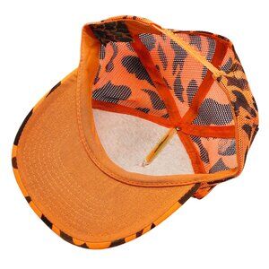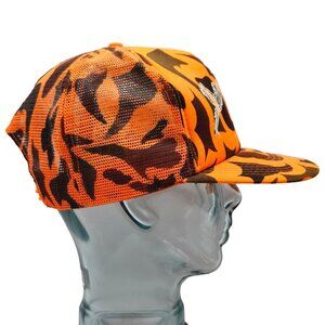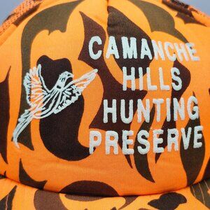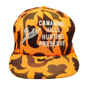 The Camanche Hills Hunting Preserve hat features a vibrant orange camo design, ideal for outdoor enthusiasts. One size fits most with an adjustable snapback closure.