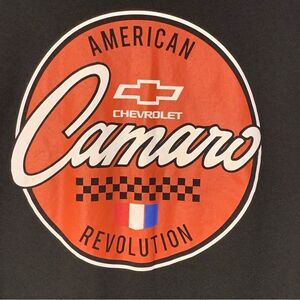This black and red short sleeve tee features a bold circular graphic inspired by vintage automotive branding. The striking red background highlights the white 'GENUINE CAMARO' text, making it a standout piece for any car enthusiast.