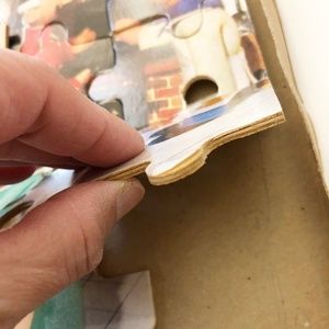 Outer box has wear -- dented top, worn and splitting corners. The puzzle pieces themselves are in good condition given its age. You can see some spots that show a little wear and a few corners where the paper is starting to lift off the wood (see last 5 pictures). Looks like it can easily be glued back on. No additional damage beyond what is noted.