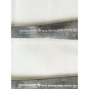 Set of four Cambridge 18/8 stainless steel soup spoons with a sleek, modern handle design. Each spoon measures about 7 ¾ inches long and is marked “CAMBRIDGE ® 18/8 STAINLESS CHINA.” Made of durable 18/8 stainless steel for long-lasting shine and everyday use. Simple and contemporary style fits easily with a variety of flatware sets.