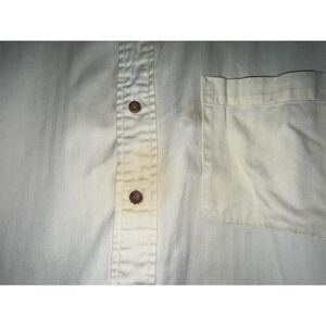 Lightweight 100% cotton shirt with a band/mandarin collar, chest pocket, and subtle herringbone texture. Color is an very light yellow. Think- butter yellow. Classic curved hem. Tagged Large.