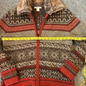 Super Cute and warm Cambridge Dry Goods100% Wool sweater with a faux fur trim. Red, brown and tan colors, warm and cozy. Perfect for winter and Christmas. Great condition! Size Small but fits like a Medium