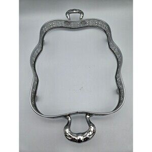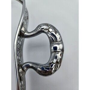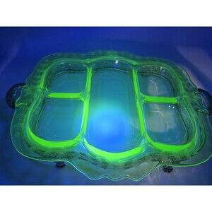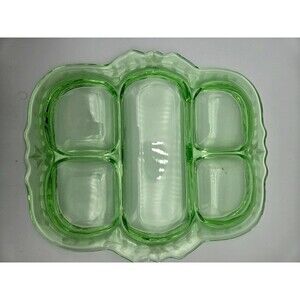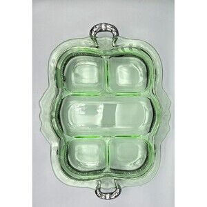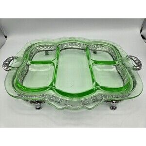 VTG Antique Cambridge Etched Green Uranium Vaseline Depression Glass Divided 5-part Relish Serving Dish With Ornate Silver Tone Metal Stand. Glows bright green. Marked Patent No. 72491