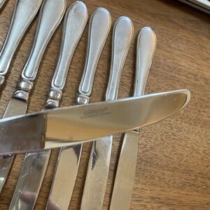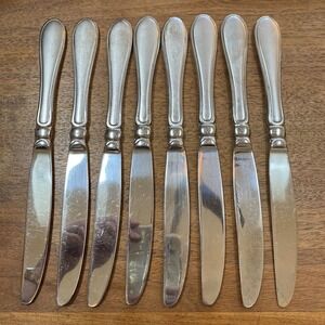 Cambridge Stainless Steel Dinner Knives in the Evanston pattern produced circa 2005 - these knives have a frosted finish with outlined edge that will mix and match well with other pieces or make a fine addition to your existing Evanston flatware service. This is a set of 8 all in excellent pre-owned condition - minor surface wear - no significant damage or flaws.