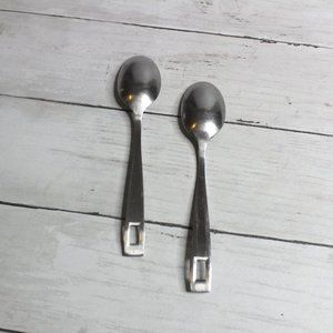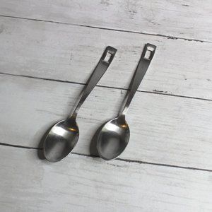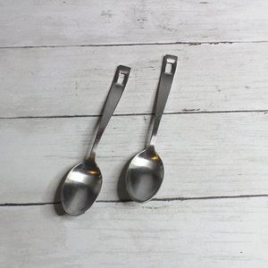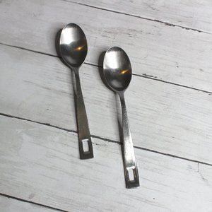 This lot includes two standard size spoons. They are heavy quality with cut outs in the handles for hanging. They are unique and would be ideal for attaching to a countertop/coffee bar/work station, etc. They're in very good used condition with slight scratches/marks/wear.