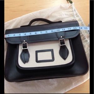 A classic in a unique design! This is dual colored in dark brown leather and an off white canvas fabric. Slight signs of wear on buckle closures, but leather is still mostly stiff. Back of bag has faint markings (see pic). As of now this bag barely fits the 13" MacBook Air (should fit comfortably once the leather softens with use). Measurements: 14" w, 9"h, 3"d. I will include the fossil dust bag I've been storing it in. Great for school or work.