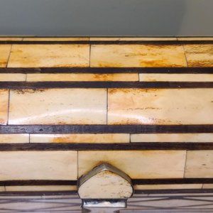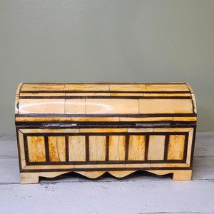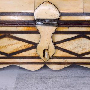 Unique inlay camel bone hinged wooden box with velvet liner, great condition. Measures 5.75 inches high x 5.25 wide x 10.75 long, inner depth is 2.5 inches. Weighs 4lbs. Bone measures approximately 1/4 inch thick.