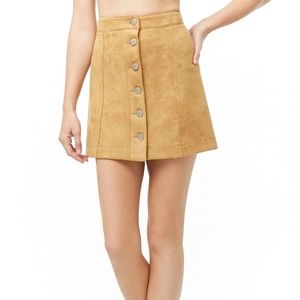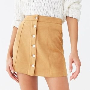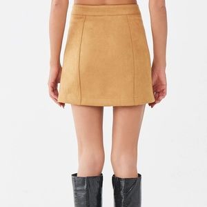 A faux suede mini skirt featuring exposed button-front closures and panel seam construction.