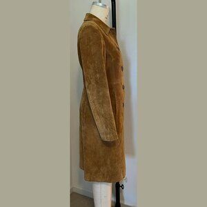 Camel colored suede coat has button front closure with bound buttonholes and pick-stitched seams. Features side pockets, fully lined, and lightly padded shoulders. S