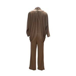 Camel Tunic Set, Relaxed Fit, Ribbed Neckline, Draped Silhouette, Modern Style, Oversized Top, Matching Pants Set, Minimalist Chic, Comfortable Loungewear, Casual Elegance, Lightweight Fabric, Contemporary Outfit, Timeless Neutral, Workwear Set, Relaxed Fashion, Versatile Ensemble