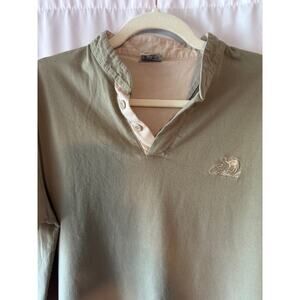 For sale is a unique vintage-style casual shirt by Cottonile, made in Egypt. This shirt is constructed from 100% cotton, making it comfortable and breathable for everyday wear. It features a distinctive two-button open placket, light tan contrast trim, and an embroidered camel logo on the chest. The subtle olive green color and classic design make it versatile for many occasions.