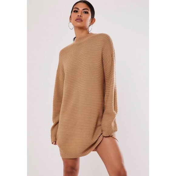 knitted ribbed mini dress in a camel hue with high neck and long sleeves. Tall Fit