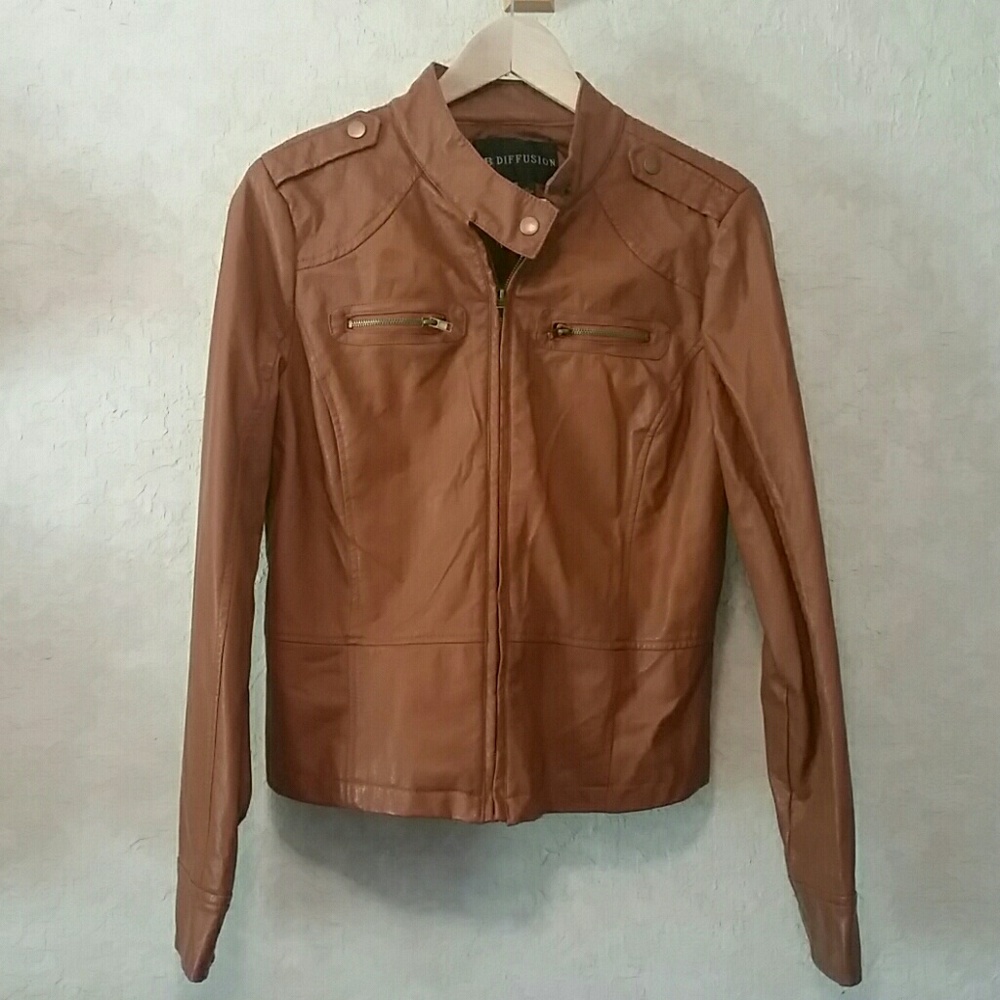 Women's size M camel color moto style jacket. Worn only a few times and looks completely new. No holes, pulls including the lining inside. A beautiful jacket to dress up a spring dress or with jeans!