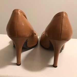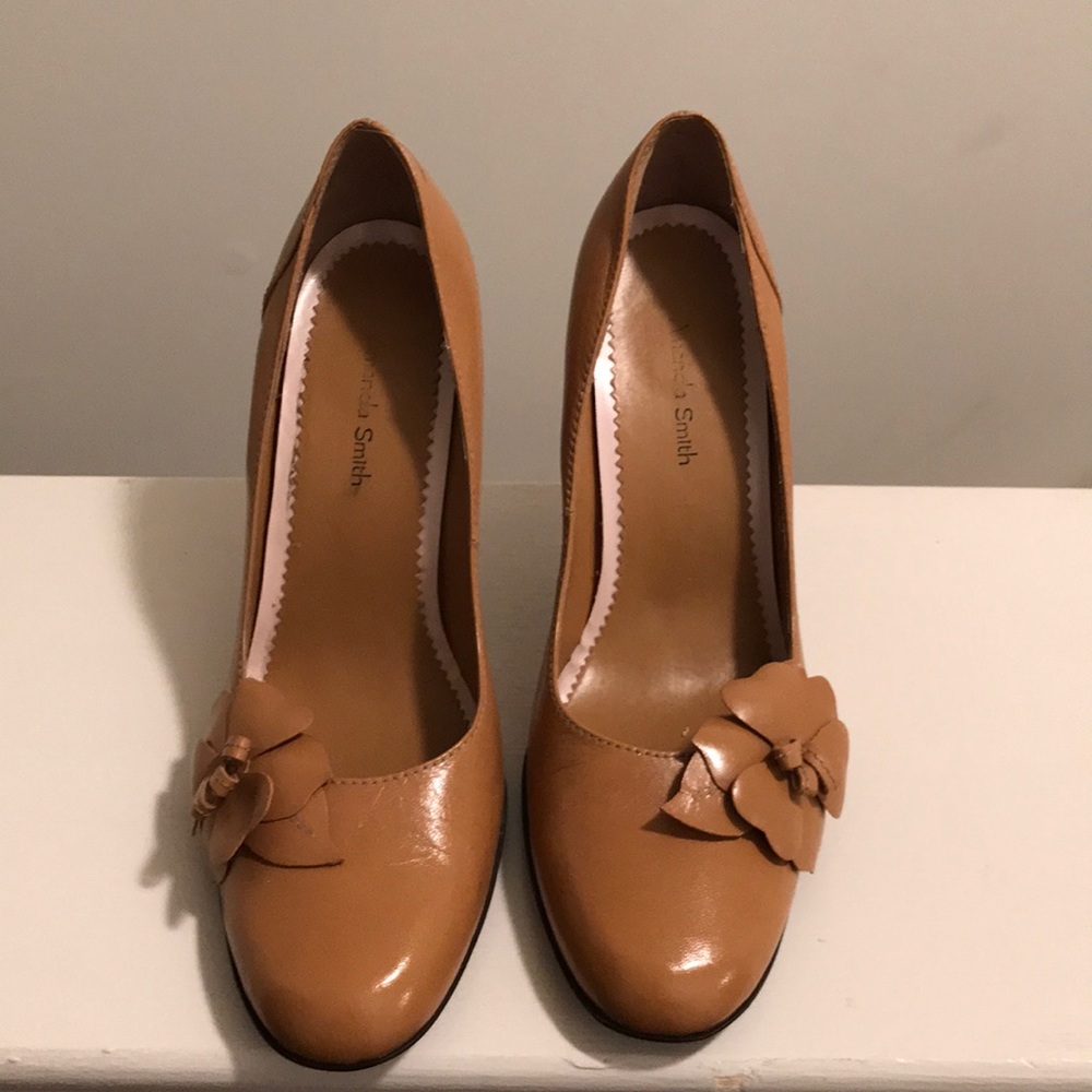 Neutral color heels with flower detail. 3 1/2 inch heel. Small scuff on inner right shoe and slight wear on left heel (both imperfections listed).