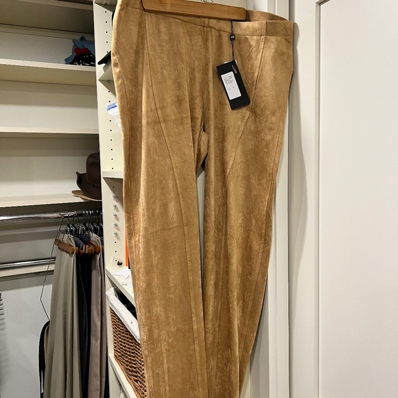 High quality full length suede camel leggings that are very well made and very comfortable and lightweight. Brand new with tags. 90% polyester, 10% spandex. Elastic waist and hem finish at legs.