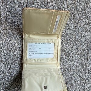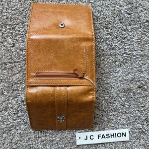 New JC Fashion Camel colored vegan Leather Wallet featuring a fleur-de-lis accent. Compact and elegant design.