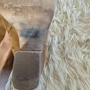 Crown Vintage camel suede block heel boot- pull on look, can be played out as a western look or simply an all occasion boot. Low side zipper. Loved condition, with a few marks that should come out with a suede cleaner. Haven't been worn in years as I moved into an 8 and then now to a 9.