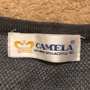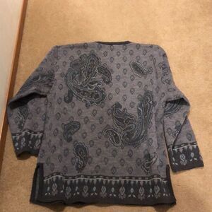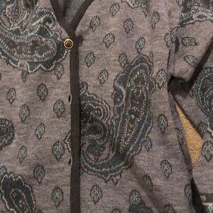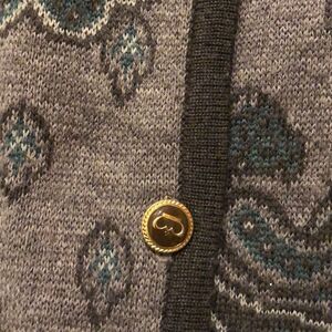 Camela Paisley button down sweater. It is 50% wool and 50% acrylic.