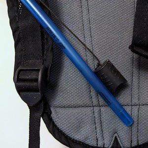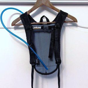 Camelbak Siren Hydro Backpack in Black/Silver/Gray with 1.5L bladder. Adjustable shoulder and chest straps. Two zippered mesh pockets under main flap. Reflective strip runs down entire front of backpack. Great for running, cycling, or hiking on busy trails and roads. Includes 1.5L bladder, hose, and bit valve cover. Missing bite valve. Used but in good condition!