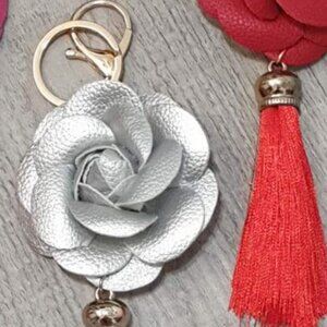 Camellia Flower Faux Leather Tassel Key Chain Keyring Handbag Charm Accessory