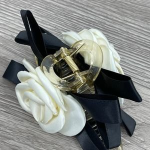 Camellia Flower Hair Clip Black Ribbon Bow Claw Clip 4" Elegant Designer - NEW
