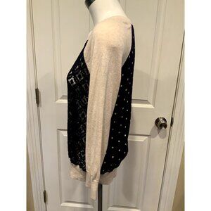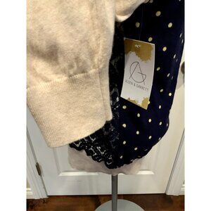 Camellia Tan & Navy Blue Button-Up Cardigan W/ Floral Lace, Size Medium, NWT!