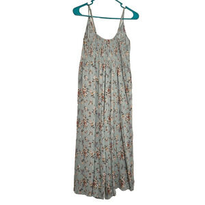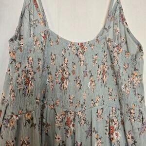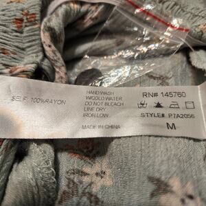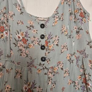 Blue floral romper by Camellia features a V-neckline and a button front closure with four buttons. The smocked back and adjustable straps provide a comfortable fit. Romper is made from 100% Rayon and is lightweight, breathable, and easy to care for. Size M, has a wide-leg with a 19-inch inseam, pockets, belt loops, and a fully lined V-neck wrap front, making it a versatile and comfortable addition to your wardrobe.