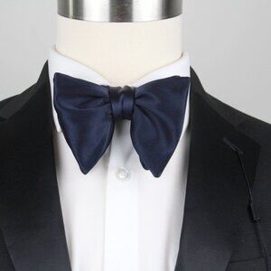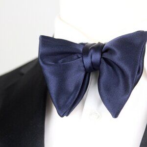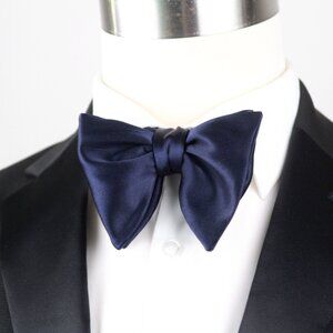 Elevate your formalwear with this elegant Camellucci self-tie bow tie, crafted in luxurious 100% silk charmeuse. The rich navy blue tone and oversized "Big Butterfly" shape make it a standout choice for black tie events, weddings, galas, or classic evening wear.