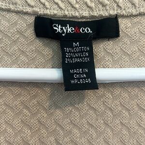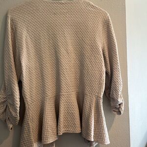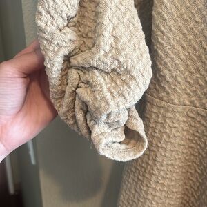 Camel/tan neutral color cover. EUC. Has 3 front buttons in front and detailed sleeves.