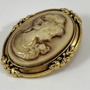 Cameo Brooch Pin Gold Tone Cream Face Vintage Look Stunning Art Deco Beautiful