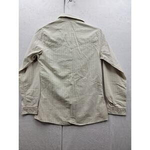 Cameo Rose Tan with white striped long sleeve button down top, size 9/10