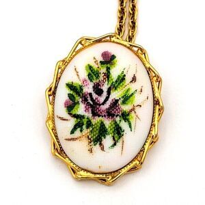 Very unique Cameo Style Floral Brooch & Pendant Style Necklace. Lovely vintage piece with a dotted floral design over milk glass.