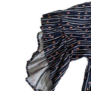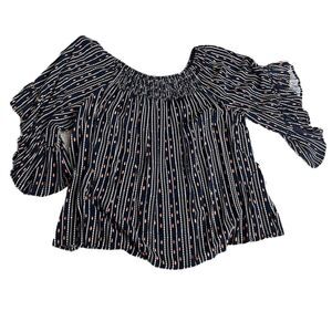 Navy blue ruched off the shoulder neckline blouse, short sleeves are ruffled, cute casual blouse from dia & co box
