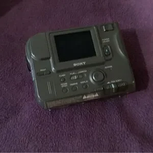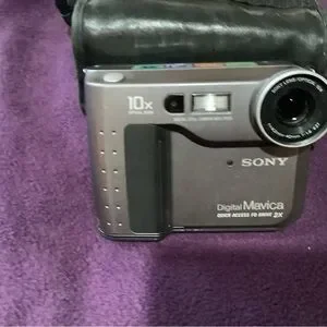 She’s an instant camera it’s made by Sony. It’s called a digital Mavica as you can see it’s lightweight. It has a cap to it. I have the bag with it and it shows you the picture on the back you have all the digital controls. Also on the back of the camera in the picture comes out the side, no film, nor digital card included as you can also see it has a light on the top and a hold for you could see through the camera, right?