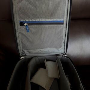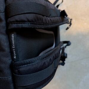 Think Tank Airport Essentials in great shape not any rips or smudges the tripod slot is a little stretched out. comes with raincoat measures 18" x11.5 " outside, it has many dividers for you to customize, non pet or smoking home , missing the waist belt.