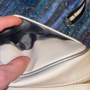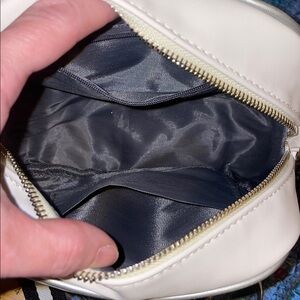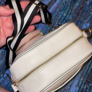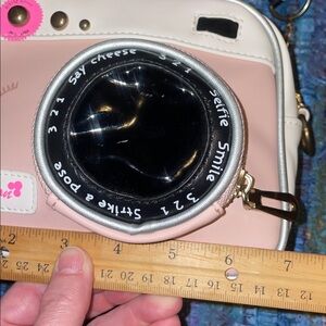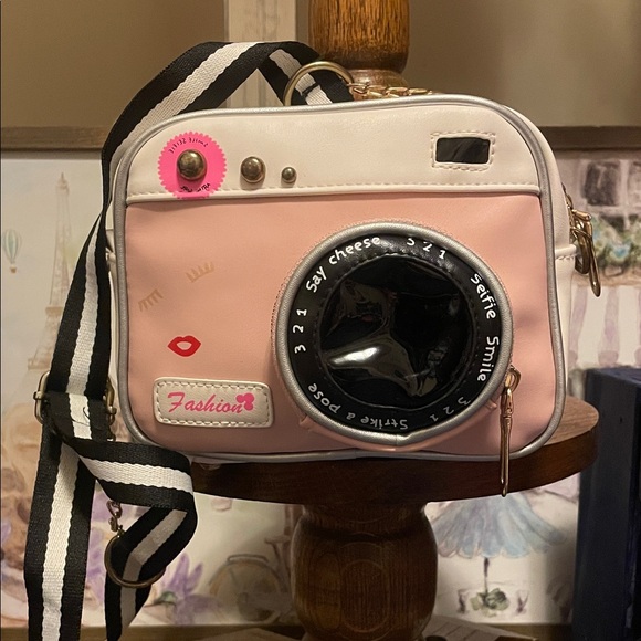 Super cute camera design bag. Adjustable strap. Small zipper section on front. Top zipper closure. Interior features one zippered pocket and one open pocket. In overall good shape. Strap has some fading and wear. Some general fading to exterior colors. Unbranded.