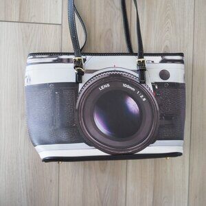 Camera Lens Print Tote Bag with Zipper top, pockets, shoulder straps, metal feet