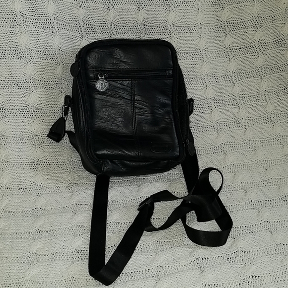 Laredo camera bag. This bag feels like leather, but doesn't have any content label. It has been very gently used. It has an adjustable strap or can be attached to a belt.