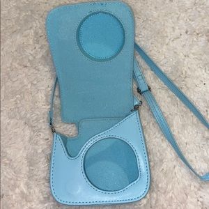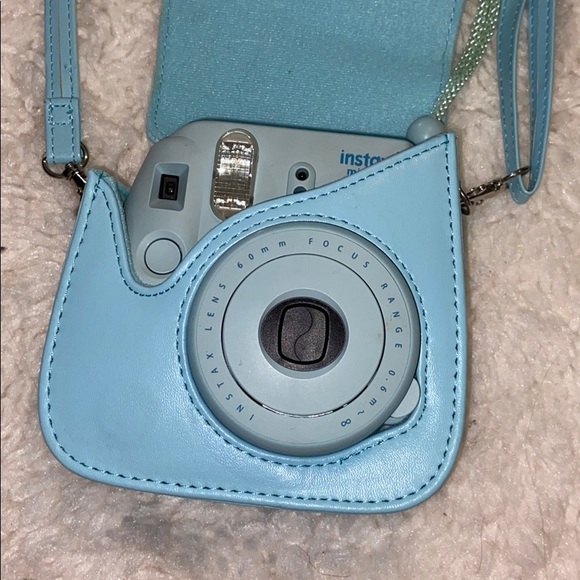 Light blue carrying case/purse for instax camera. Adjustable strap.